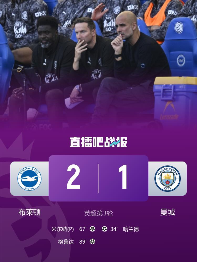 全场比赛结束,最终曼城1-2布莱顿。