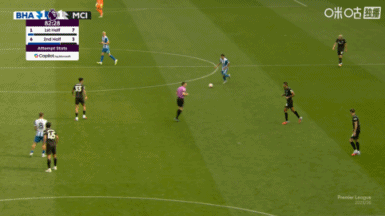 上半场伤停补时3分钟,半场结束,曼城暂1-0布莱顿。