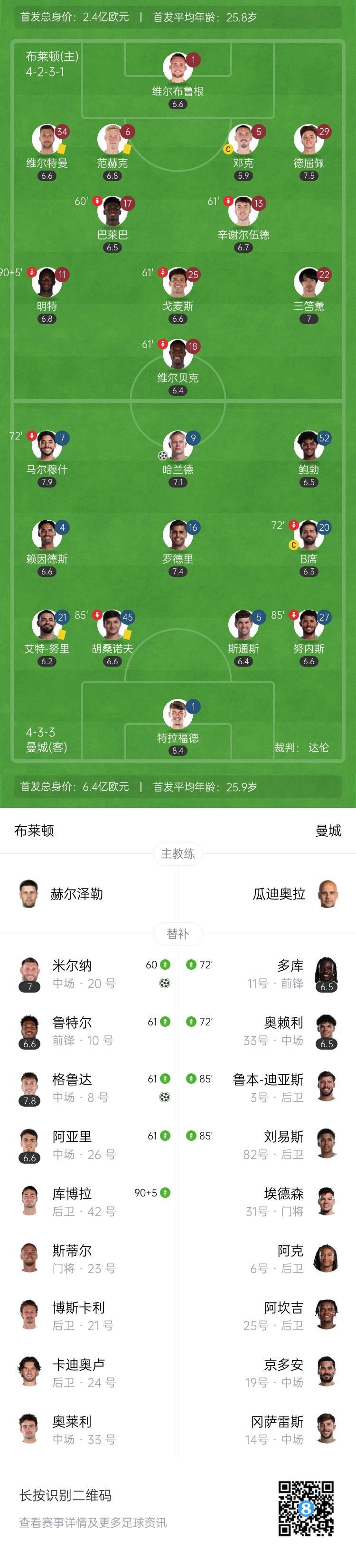 第34分钟,鲍勃横传,马尔穆什得球禁区内遭遇包夹,随后将球捅给哈兰德,后者抢在维尔布鲁根之前将球打进,曼城1-0布莱顿。↓